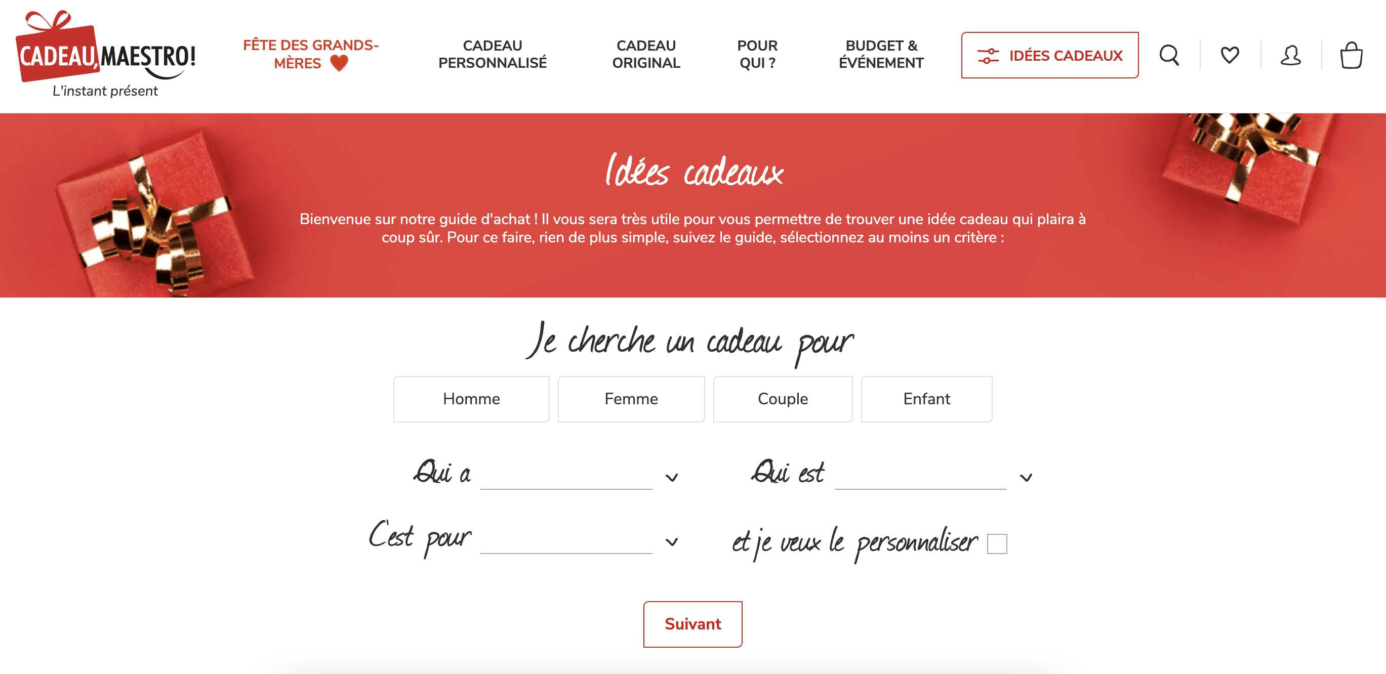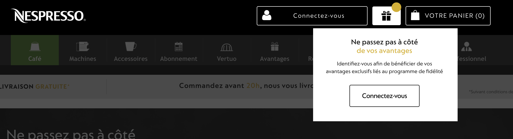 En premier lieu, l’inscription . La création de compte pour l’utilisateur d’un site est l’occasion d’obtenir un grand nombre d’informations qui permettront ensuite au site de personnaliser la navigation, mais également de personnaliser des offres par le biais d’autres canaux comme l’email. Ici, Nespresso incite à la création de compte en ajoutant une notification associée au symbole “cadeau” :