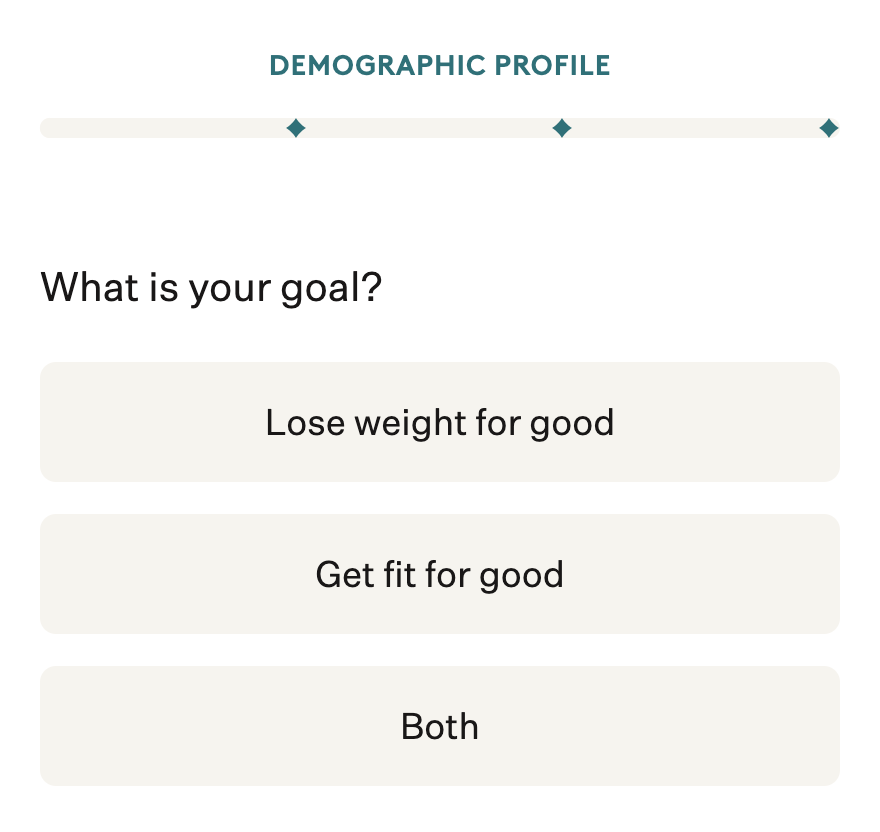 Par exemple, Noom est une marque qui propose des programmes d’accompagnement pour mieux manger. Sur son site, elle propose aux utilisateurs de répondre à quelques questions pour définir leur profil :