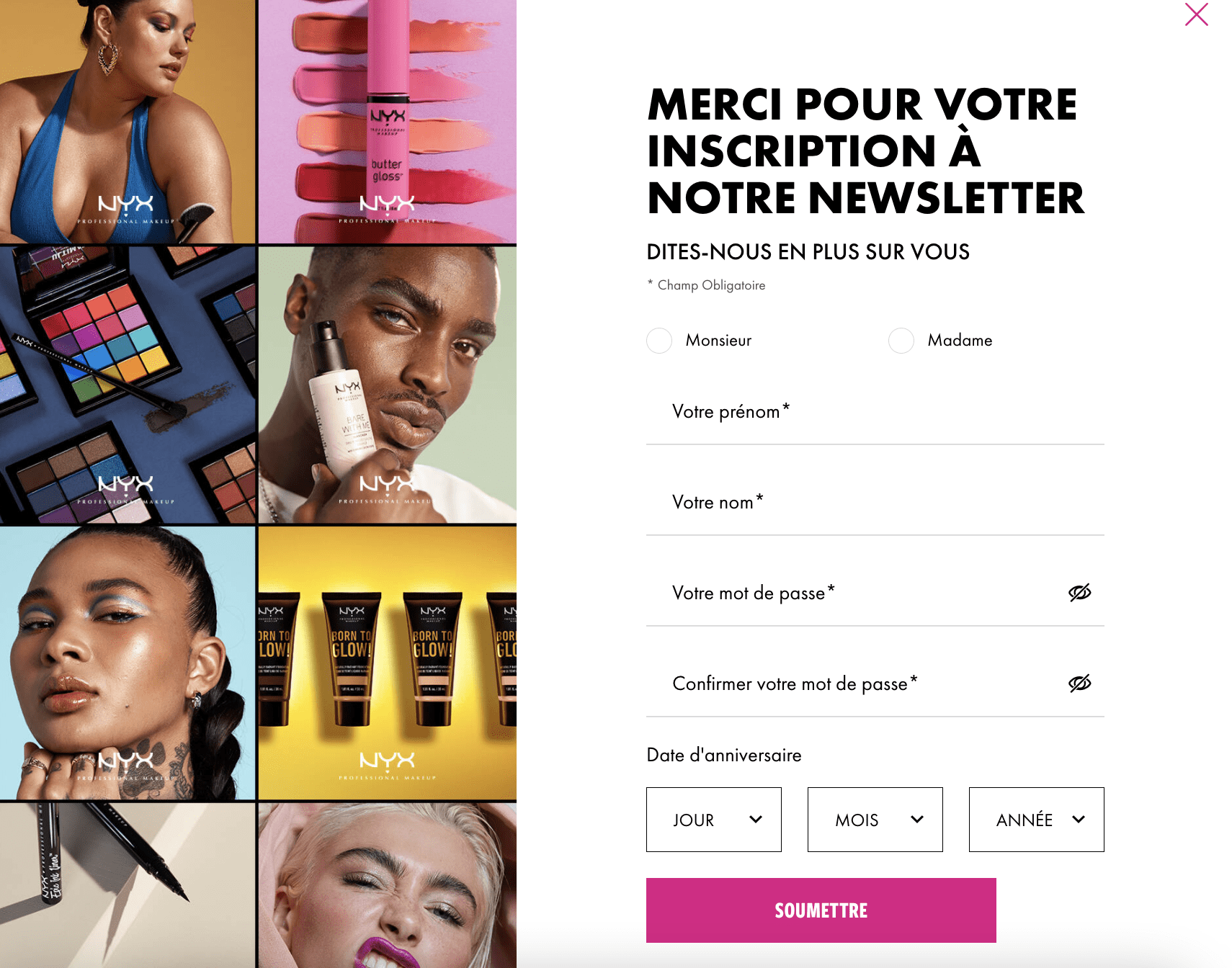 Enfin, l’inscription à une newsletter. L’abonnement à une newsletter peut être le moment de collecter des informations sur les utilisateurs et de cibler plus précisément les personnes intéressées par le contenu produit par la marque. Parfois, l’abonnement à la newsletter fait l’objet d’une inscription plus large à un compte utilisateur, comme ici chez NYX :